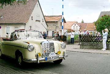 Autofreunde applaudieren einem MB 220S Cabriolet. |